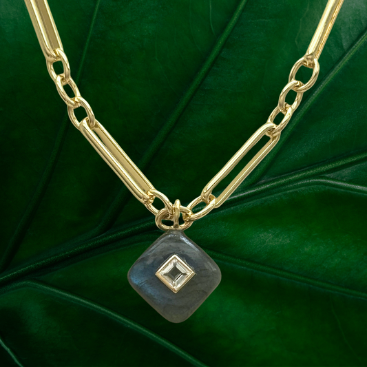 Rectangular Lapis Lazuli with Amber Cubic Zirconia Inlay Pendant Necklace