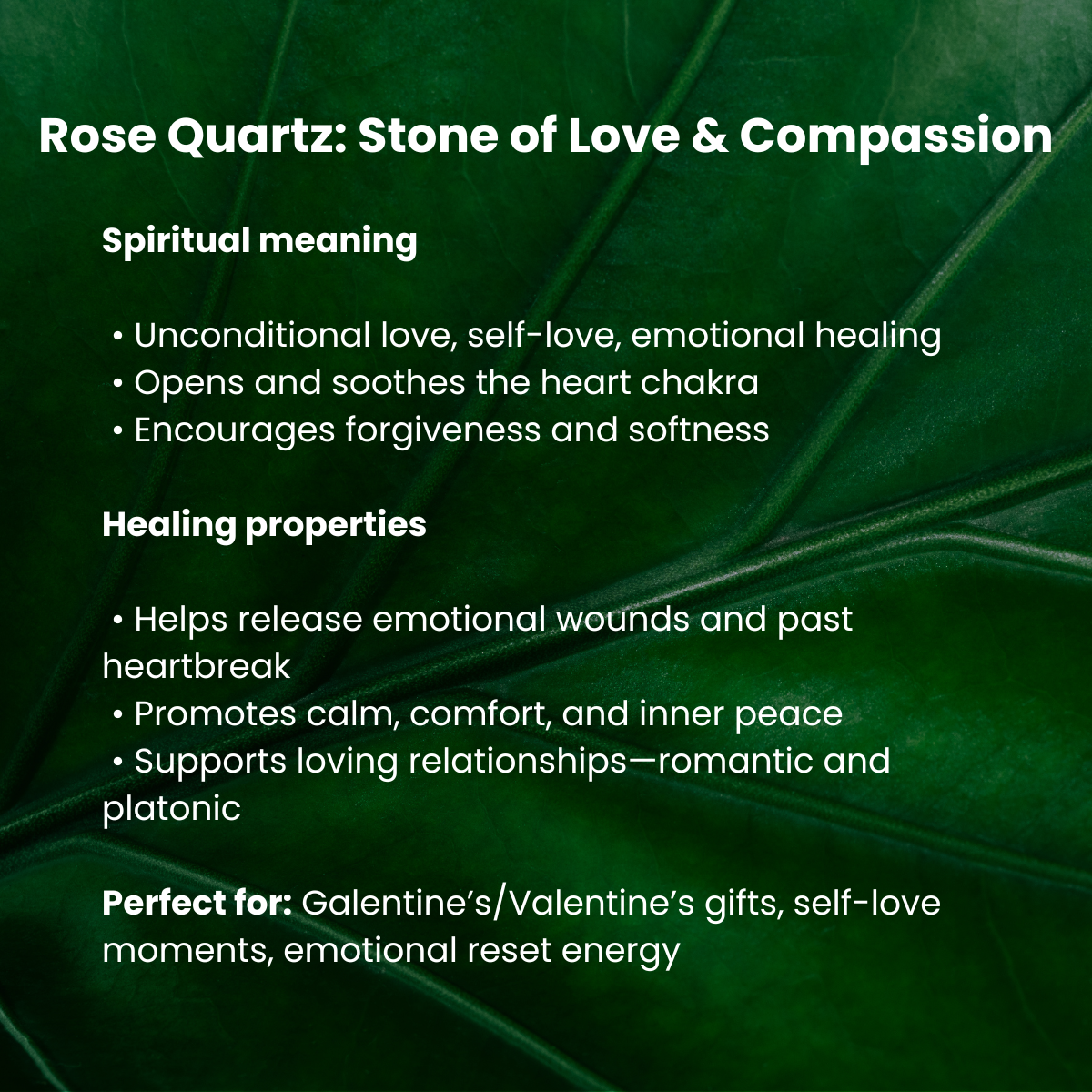 Rose quartz is known as the stone of love, believed to gently open the heart, promote self-love and compassion, and invite calm, loving energy, especially when worn close to the skin.
